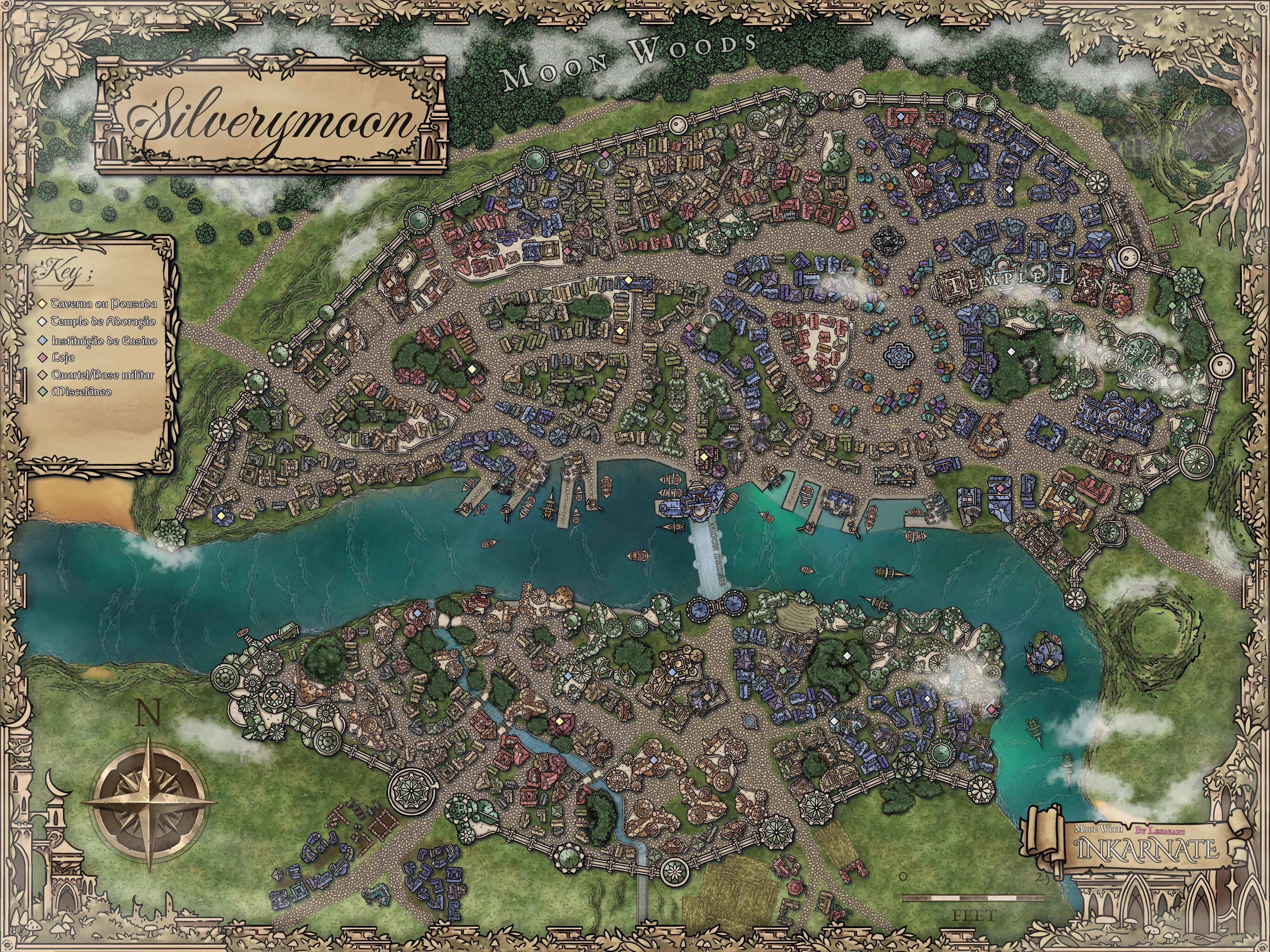 A cidade é dividida em dois lados, a Margem Norte e a Margem Sul, divididas pelo Rio Rauvin. A Ponte da Lua, construção mágica que brilha prateada durante a noite e pode se tornar intangível para que grandes navios cruzem o rio, une as duas margens.